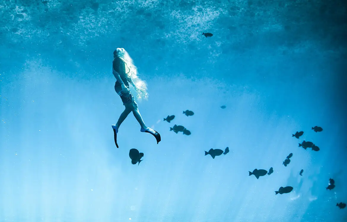Masks are typically much lower volume than dive masks, more similar to swim goggles. Fins are much longer than dive fins, and monofins, where both feet are in the same fin, are sometimes used. Unlike snorkeling and skin diving, the main goal is to spend as much time underwater as possible. And time in the surface is only meant to re-oxygenate the body between dives. A snorkel is often not used. In very much layman’s terms, you could say that snorkeling is surface only, free diving strives to underwater only (or at least as much as possible), while skin diving mix the two. Participants in all three activities may not like this definition, but it can help others distinguish between them.